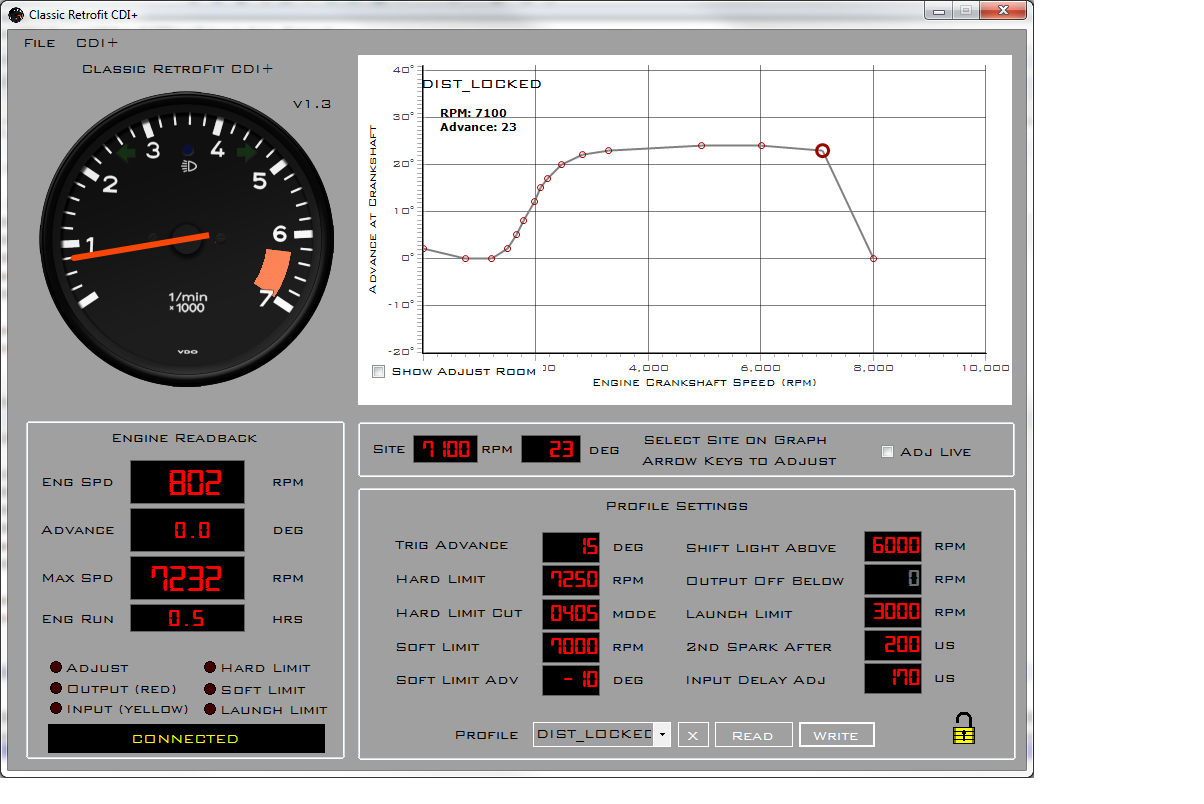 The unit works with the existing distributor without modification and can use the weights and springs for the advance curve. It can also be programmed with a custom ignition timing ‘map’ by connecting a laptop (cable supplied). The ignition map can either work with a locked distributor or by ‘overlaying’ advance on top of the standard distributor mechanical advance.