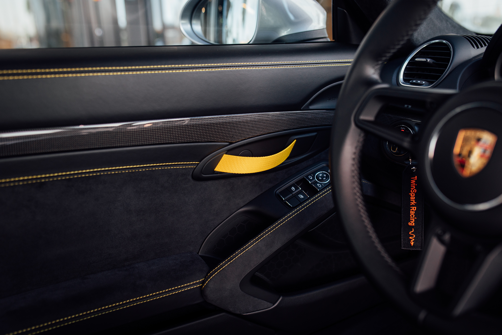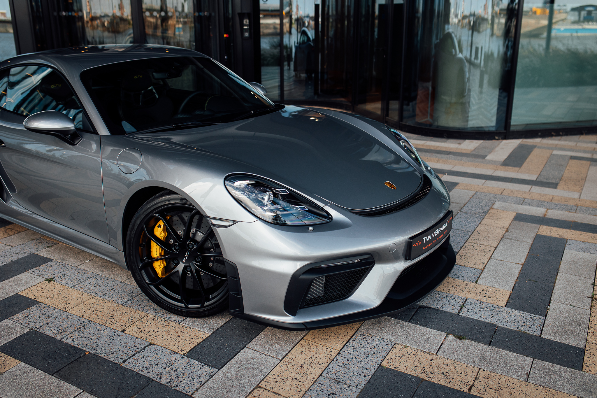TwinSpark Racing is proud to offer this beautiful Porsche Cayman 718 GT4 in GT silver. Originally delivered in Germany and just one owner. This example is finished in GT Silver Metallic with gloss black highlights over a black leather and Alcantara-trimmed cabin punctuated by Speed Yellow stitching and door pulls, ‘GT4’-embroidered headrests, and carbon-fibre trim.
